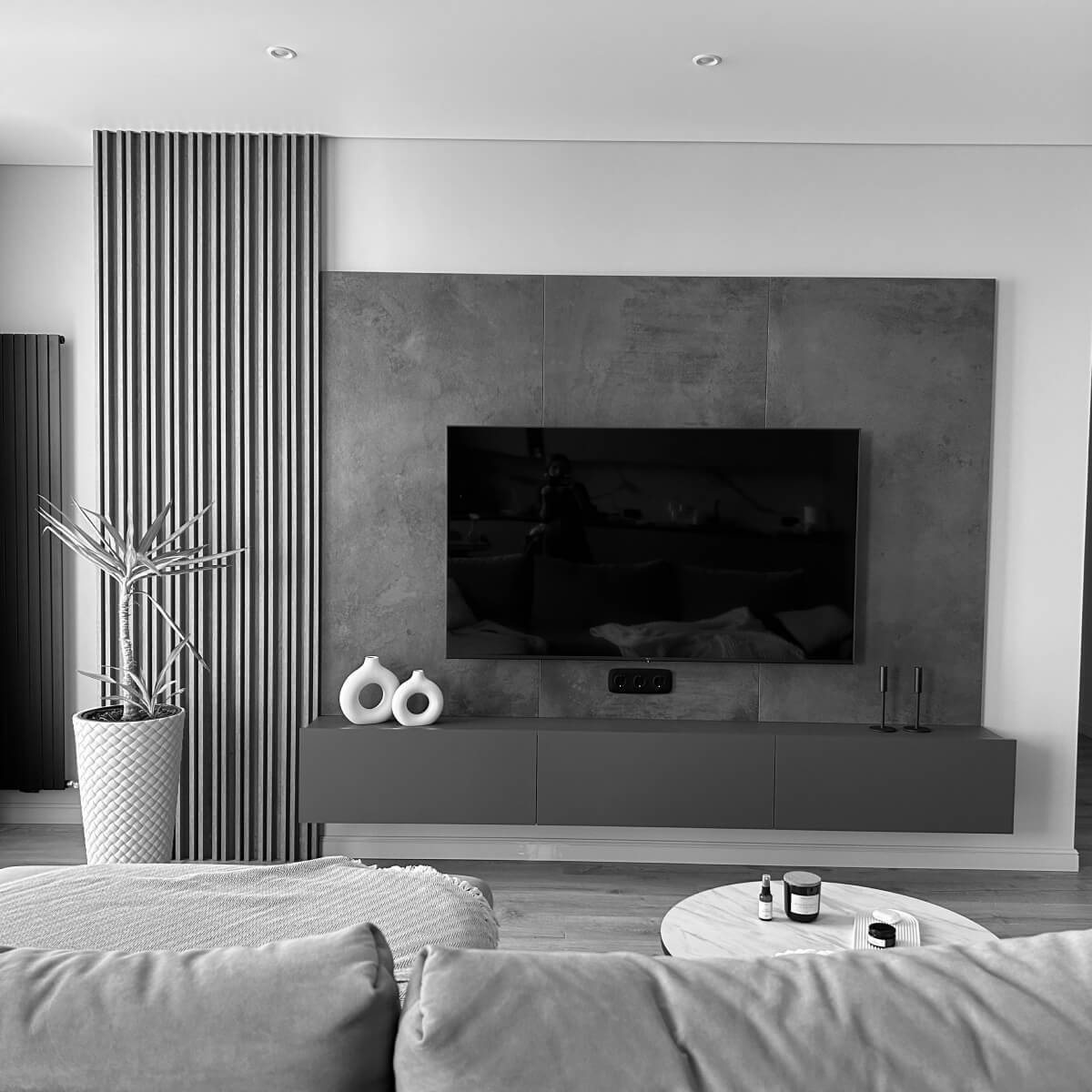 Основу цветовой палитры составляют нейтральные серые оттенки стен, которые служат фоном для терракотовых акцентов. Этот насыщенный оттенок присутствует на стене в гостиной за диваном, на кухне за телевизором, а также на фасадах и на столбе, облицованном плиткой.
